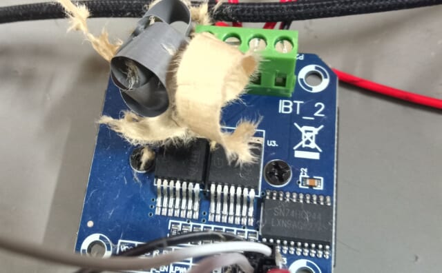DCモーター、モータードライバーが届いたのでまずはモーターを回すテストです。マキタのバッテリー(14V)とArduino UNO Qは手元にありますので、モータードライバーとモーターをつなげるだけの簡単なテストです。コンデンサーが爆発簡単!と舐めていました。Arduinoに簡単なプログラムを書き込み通電させテストしてみました。すぐにモータードライバーから煙が出てきて「キュィィン!ポンっ!!」とコンデンサーが爆発しました。何度も接続場所はチェックしたはずなのに・・・モータードライバーの初期不良なんじゃ?と疑いましたが、一旦バラして接続し直ししている時に気づきました。マキタのバッテリーコネクターへ...